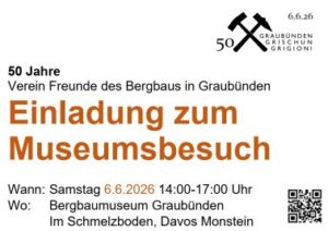 Besuche ausserhalb der offiziellen Öffnungszeiten sind auf Voranmeldung nach Absprache möglich. Bitte kontaktieren Sie: info@bergbau-museum.ch